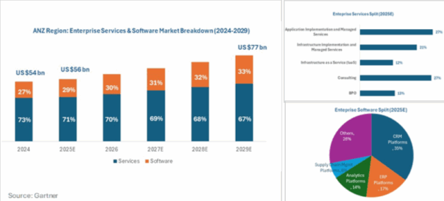 The Australia-New Zealand region continues to stand out for its technology-driven growth and M&A momentum. In 2024, the ANZ enterprise services, and software market reached US $54 bn (Enterprise Services: US $39 bn, Enterprise Software: US $14 bn). By 2025, it is projected to hit US $56 bn, powered by US $40 bn in services and US $16 bn in enterprise software.